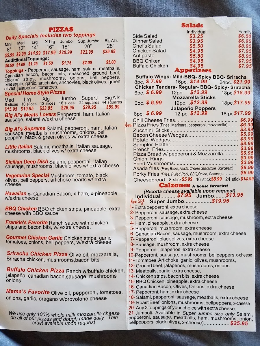 Welcome to Big Al's Pizza, where mouthwatering flavors meet generous portions! Located at 40340 170th St E, Palmdale, CA, this cozy eatery is a haven for pizza enthusiasts and comfort food lovers alike. The menu boasts a variety of offerings that cater to every taste.